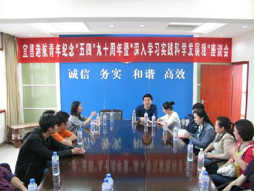 随后,局团支部召开了纪念五四90周年暨深入学习实践科学发展观座谈会。会上,总结了团支部一年来的工作和取得的成绩。结合当前开展的深入学习实践科学发展观活动,市港航局团支部在全体团员青年中发起了为期一个月的深入学习实践科学发展观读书月活动。同时,针对此次看发展活动以及团的建设、青年活动、学习实践科学发展观的体会等,团员青年们谈感受、说体会、提建议,畅所欲言,气氛热烈。大家认为,看到港航事业和农业科技的发展进步,振奋人心,这样的活动很有意义,既增长了见识,开阔了眼界,陶冶了情操,又增进了青年之间的交流和沟通,希望能多组织开展这样的集体活动。团员青年们纷纷表示,要深入学习实践科学发展观,立足岗位,踏实工作,以优异的工作成绩为开创宜昌港航海事工作新局面而努力奋斗,向祖国60周年华诞献礼!