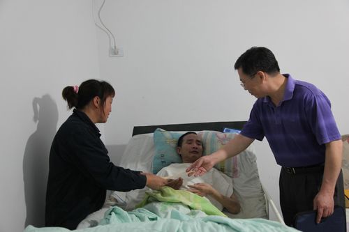 局领导一行来到一组村民韩培荣家中,他的妻子赵红英含着眼泪介绍了家中的相关情况,丈夫从2010年10月份在上班途中发生车祸后入院的治疗及康复情况,最后诊断为一级伤残,全身都丧失了运动功能,生活完全不能自理。加上去年17岁儿子也因抢夺犯罪入狱,家中非常困难。局领导来到韩培荣的床前,仔细了解韩培荣的病情,向他送上了慰问金。病床上的韩培荣激动地流下了眼泪。得知韩培荣已经被宜昌市人社局鉴定为工伤,嘱咐家人要通过正常的法律渠道维护合法权益,并安排我局驻村的“三万”工作队员向当地民政部门了解相关救助政策,汇报情况,争取得到相关救助。最后,局领导还再三要求赵红英,精心照顾好丈夫,鼓励在狱中的儿子,好好改造,争取减刑出狱,早日摆脱困境。