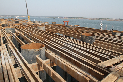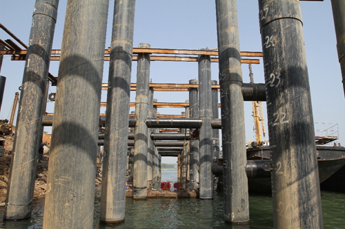 白洋港位于宜昌高新区白洋工业园区,项目总投资20亿元,规划面积1400亩,一次规划,分期建设。其中:码头一期工程拟建3000吨级(水工结构5000吨级)泊位6个,概算投资8.18亿元,2012年7月开工建设,现已完成水下抛石抛砂、钢管桩沉桩施工及嵌岩、引桥钻孔桩施工、梁板现场预制及陆域堆场回填等工作,计划2013年底1#2#泊位基本建成并投产。