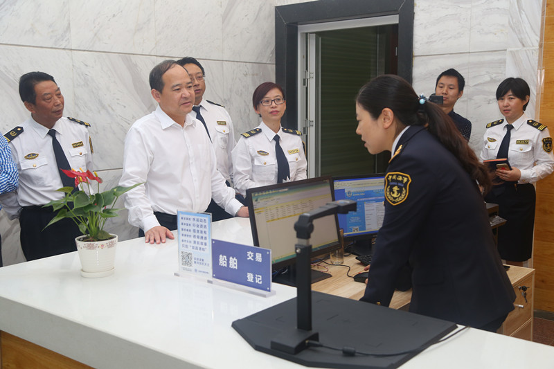 在船舶交易大厅,王局长详细询问了业务办理流程和市场交易情况,对交易中心服务和运营情况表示高度肯定,并要求工作人员严把资质核查关,确保工作质量。在船检电子档案室,王局长仔细观看了我局自主研制的船检档案软件的操作步骤,查看了整理规范的船检档案室,鼓励我局进一步创新先行,走在行业前列。
