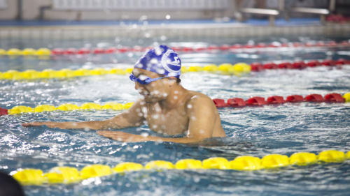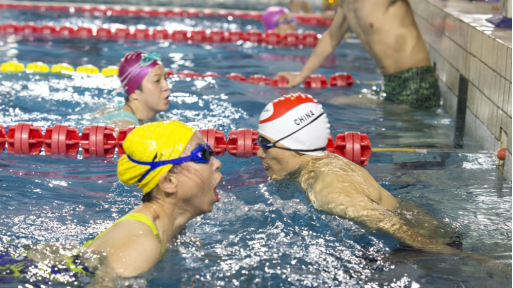 团体比武最为激动人心。随着发令员一声枪响,各队选手劈波斩浪,你追我赶,努力前行,湛蓝的泳池水花翻飞,场外呐喊声、助威声不绝于耳。