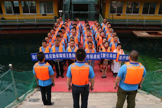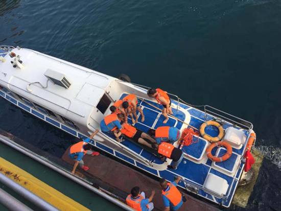 与此同时,接到指令后的“盐水女神”号船员及随船导游立即分成三队,一队人员边向落水人员抛投救生浮具,边对周边环境保持警戒瞭望;一队人员迅速穿戴上救生衣,入水施救;一队人员在疏散二楼甲板游客维持船上秩序的同时,组织乘客穿戴救生衣,并安抚其情绪。以上三步同时进行,有条不紊,一气呵成。