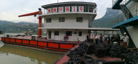 该船名为“夷陵环保1号”,长35米,宽11米,具有270度垃圾箱悬臂吊,最大起重5吨。垃圾通过悬臂起吊上岸,油污水经趸船泵运,岸上垃圾压缩,实现各类船舶垃圾全流程高效转运,建成后将放置于三峡坝上太平溪港区,承担三峡近坝区船舶垃圾油污水回收任务,为库区清洁水运护航。