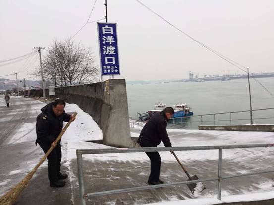 二是除雪保畅立足“快”。第一时间组织港航海事干部职工,深入渡口、港口、码头现场,帮助铲除积雪,确保人民群众出行安全。