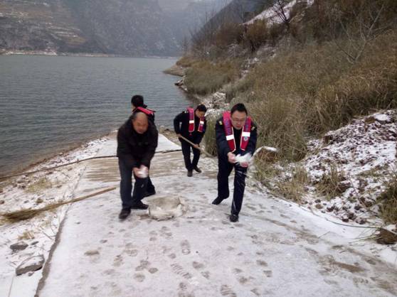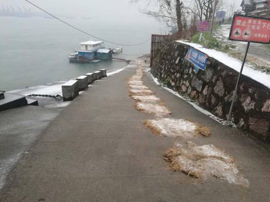 二是除雪保畅,应急物资“早准备”。督促港口做好冰冻低温天气装卸作业防范工作。港口企业配备防滑防冻物资、警示标志标牌、防护网、三角木等设备。在码头结冰路段投洒工业盐、消冰剂,并加强港口装卸作业设施设备维护保养,确保港口作业安全。在重点渡口、船头甲板、滚装船跳板、渡船踏板及上下船通道等地铺设防滑毯及草垫等防滑设施。