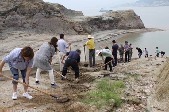 黄色的江岸上红色条幅高高悬挂,烈日下20多名党员聚集在老太平溪渡口,重温了入党誓词,学习了习总书记有关长江大保护的讲话精神。