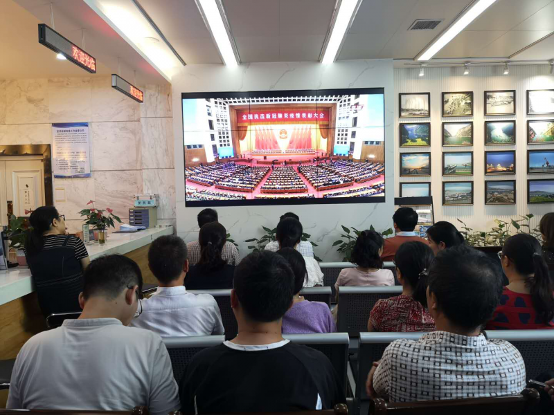 9月8日上午10点,中心干部职工集中在一楼大厅收看全国抗击新冠肺炎疫情表彰大会。中心主任梅常春同志参加收看。