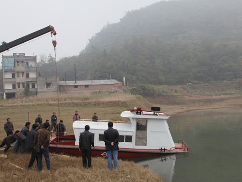 今年,宜昌市地方海事局与点军区交通局、土城乡负责人一起,多次开会研究协调,紧紧抓住全省老旧渡船改造、国家“以奖代补”这一政策契机,先行筹措10万元资金打造了一艘长9米、宽2.2米、高2.4米、功率7000瓦、载重吨1.5吨的新渡船。今天,是新船下水的日子,周边的群众早早地都聚集在王家坝水库周围,迎接这一喜庆的时刻。