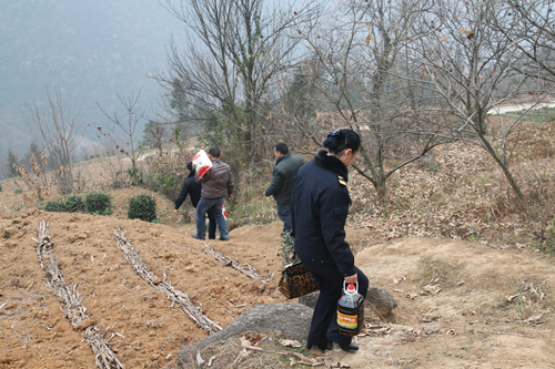 工作组人员走山路为五保户送去生活必需品